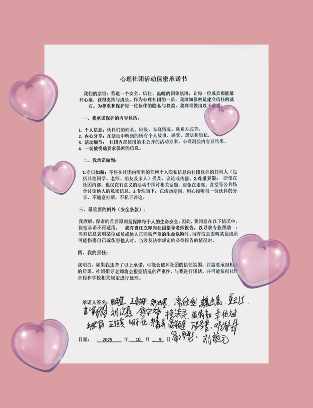 心理社团是一个以心理健康为核心,专注于心理健康知识普及、心理支持服务和教育活动的社团组织。此课程由国家二级心理咨询师华沁老师组织并开展活动,开课前华沁老师介绍了社团宗旨,为了保护同学隐私,社团成员签署保密协议。