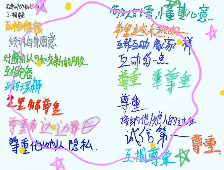 同学们共同讨论并制定社团公约,如:保密、尊重、倾听……并在“契约树”上画上自己代表自己的叶子。第一课的趣味签名:发放彩色卡片,每人画一个代表自己的“表情包”或“符号”并署名,大家相互介绍、交换签名 ,增加熟悉度和连接感。