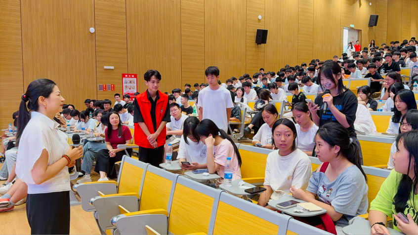 2025年9月2日上午,我校为2025级全体新生举办了一场“认识自我、健康成长”的心理知识讲座。该讲座由我校学工处负责心理健康工作的华沁老师主讲。华老师首先用一个2分钟的身体“投票”与快速调查的热身活动,让学生用身体动作(举手、站立、鼓掌等)回答问题,快速激活全场,营造出热烈氛围,将学子们自然地引入对讲座主题的关注和期待。
