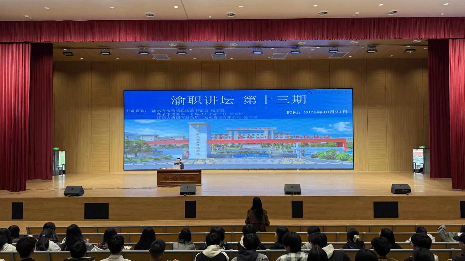 2025 年 10 月 21 日下午,我校《渝职讲坛》第十三期活动在学校至善楼报告厅举行。此次活动由学工处团委主办,特邀新余市青年讲师团三位成员 —— 新余市税务局一分局办公室副主任管璇悦、渝水区检察院政治部书记员张子懿、江西大唐国际新余第二发电责任有限公司晏文昊开讲,我校25 级全体学生现场参与,旨在引导学子明晰青年使命,以青春之力为中国式现代化挺膺担当。